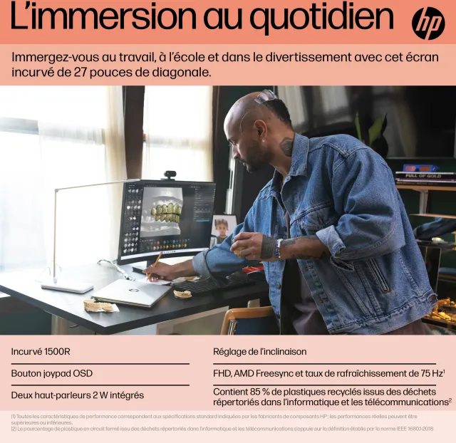 L’immersion au quotidien Immergez-vous au travail, à l’école et dans le divertissement avec cet écran incurvé de 27 pouces de diagonale. Désormais, vous pouvez bénéficier d’une productivité accrue au quotidien avec ce séduisant écran FHD incurvé, fluide et ininterrompu[1], directement chez vous. Avec le design moderne et fonctionnel, il n’a jamais été aussi facile d’en faire plus et de s’amuser davantage.