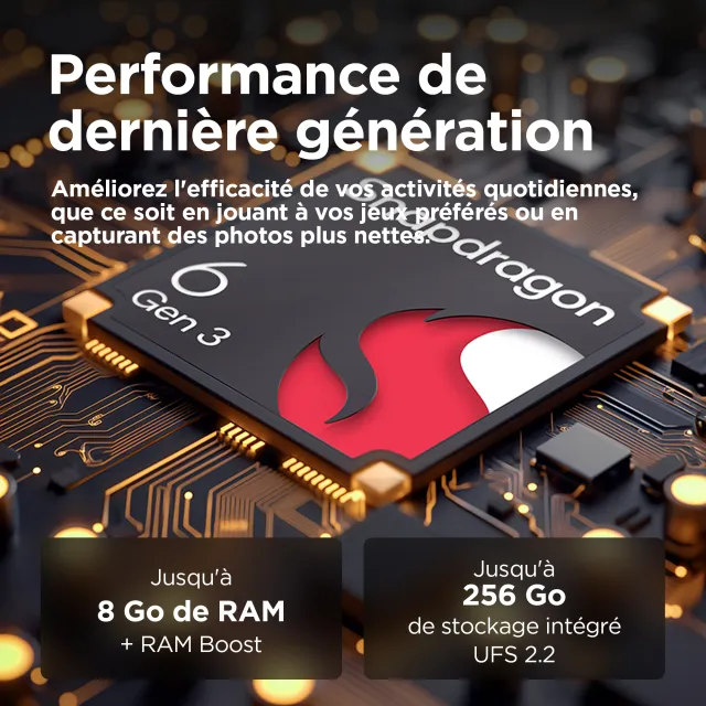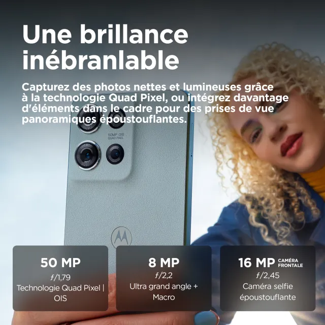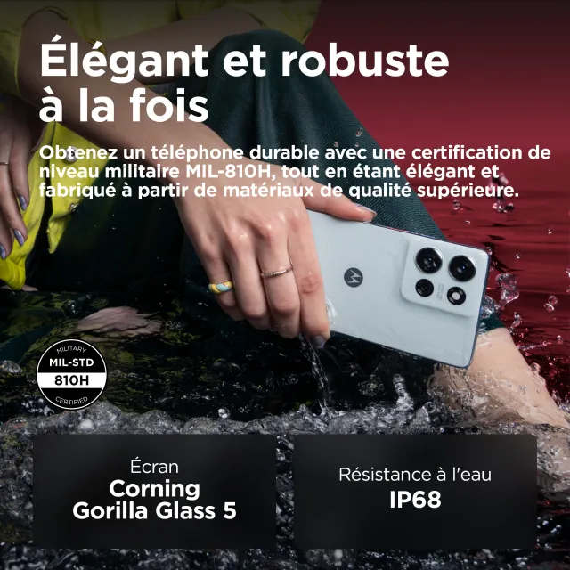 Conçu pour impressionner. Conçu pour durer. Vous ne devriez pas avoir à privilégier l’élégance de votre smartphone au détriment de sa durabilité. Découvrez le moto g75 5G. Conçu à partir de matériaux haut de gamme, il offre une durabilité répondant à des normes militaires(10) ainsi qu’une résistance à l’immersion IP68(2) et un verre Corning® Gorilla® Glass 5 afin de faire face à toutes les péripéties du quotidien. Prenez des photos d’une incroyable netteté et réalisez des vidéos ultra fluides avec l’appareil photo Sony LYTIA™ 600 équipé de la stabilisation d’image optique. Profitez pleinement de votre contenu sur un écran Full HD+ ultra lumineux de 6,78" accompagné du son Dolby Atmos®. Soyez le premier à bénéficier de l’ingénieuse efficacité du tout dernierprocesseur Qualcomm® Snapdragon® et de l’extension de RAM(3). De plus, grâce à une batterie de 5 000 mAh, à la charge TurboPower™ 30(6) et à la charge sans fil de 15 W(7)en option, vous pouvez poursuivre vos explorations sans aucune interruption. Et tout cela avec, 256 Go(8, 9) de stockage intégré pour enregistrer vos photos, titres musicaux, films et plus encore. La vie est une aventure. Abordez-la avec élégance grâce au nouveau moto g75 5G.