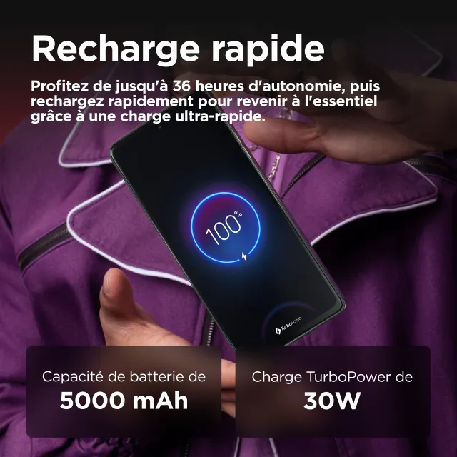 La fonction charge rapide permet de charger votre téléphone jusqu'à 80% en 30 minutes environ.