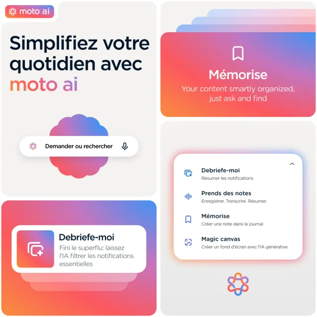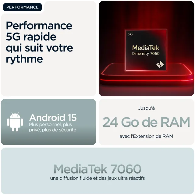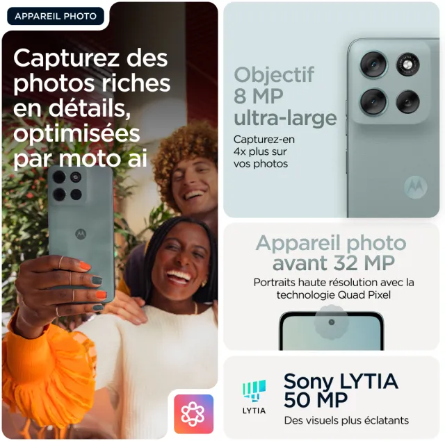 SUPERBEMENT CONSTRUIT. DURABLEMENT CONÇU. Voici le moto g56 5G, un concentré de design élégant, de durabilité et de praticité. Profitez d’une finition haut de gamme offrant une prise en main facile et douce au toucher, associée à une résistance à l’immersion, aux températures extrêmes et à un écran protégé contre les rayures(1, 2), pour que vous ayez l’esprit tranquille. Faites passer vos divertissements au niveau supérieur grâce à son écran FHD+ de 6,72" accompagné de haut-parleurs stéréo équipés de Bass Boost. Prenez des photos exceptionnelles, quelle que soit la luminosité, avec son appareil photo de 50 MP équipé d’un capteur Sony LYTIA™ et optimisé par moto ai. Le chargeur TurboPower™ vous offre des heures d’autonomie en quelques minutes de charge(3, 4). Profitez de la puissance d’un processeur octa-core et de la vitesse de la 5G(5), sans oublier un vaste espace de stockage pour vos photos, films, titres musicaux et applications. Voici le nouveau moto g56 5G. Durabilité et élégance.
