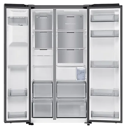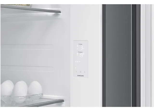 Contrôle à distance simplifié Wi-Fi intégré Gérez les fonctionnalités du réfrigérateur où que vous soyez, grâce au Wi-Fi intégré et l'application SmartThings[1]. Vous pouvez contrôler les modes de refroidissement rapide, la température et recevoir des alertes si la porte reste ouverte. Vous pouvez également surveiller sa consommation d'énergie. Efficience constante Compresseur haute efficacité amélioré La nouvelle génération du Digital Inverter possède une nouvelle structure améliorée, avec une inertie 4,1 fois supérieure à la génération précedente. Son fonctionnement est donc plus efficient. La garantie 20 ans du compresseur Digital Inverter est applicable aux modèles vendus à compter du 1er Juillet 2022. Au titre de cette garantie, après deux ans suivant la date dachat, la pièce de remplacement sera gratuite (les autres frais liés à lintervention tels que frais de déplacement ou de main dœuvre seront à la charge de lutilisateur final). Voir conditions sur https://www.samsung.com/fr/support/warranty/ Une fraîcheur uniforme à tous les étages Technologie Multi-Flow Le système All-Around Cooling refroidit lensemble du réfrigérateur de manière homogène. Lair frais est ventilé par de multiples aérations au niveau de chaque étagère pour maintenir une température constante et garder les produits frais plus longtemps[2] Disponible sur les appareils Android et iOS. Retient le froid pour une fraîcheur durable Metal Cooling Conservez la fraîcheur des aliments, même si vous ouvrez et fermez fréquemment la porte du réfrigérateur. La plaque Metal Cooling située dans la paroi arrière permet de maintenir une température interne optimale. Elle retient le froid et le restitue après une ouverture de porte. Une réfrigération et congélation rapide Fonction réfrigération et congélation rapide La fonction réfrigération et congélation rapide crée un souffle intense d'air froid, idéal d'une part pour refroidir rapidement vos courses et boissons préférées, d'autre part pour congeler des aliments frais et fabriquer de la glace. SmartThings Energy™ Suivi de la consommation énergétique Le mode Energy de 'SmartThings™*] fournit des conseils en matière d'efficacité énergétique. Suivez la consommation d'énergie de votre réfrigérateur en temps réel et comparez-la à celle du mois précédent. Il vous alerte si vous établissez un objectif de consommation et que celui-ci est dépassé. SmartThings™ Home Care Maintenance et entretien simplifiés Prenez soin de votre réfrigérateur plus facilement. SmartThings Home Care[3] fournit une surveillance et des alertes en temps réel. Il vous avertit automatiquement si des pièces doivent être remplacées ou si des problèmes sont détectés. SmartThings™ Food Organisez vos courses, cuisinez des plats savoureux SmartThings™ Food[4] vous permet de créer une liste des aliments disponibles et de gérer les dates de péremption, afin que vous puissiez vérifier ce dont vous disposez. SmartThings vous recommande également des recettes personnalisées en fonction de vos préférences et des ingrédients restants. Glace et eau au robinet Distributeur d'eau et de glace Profitez de boissons fraîches ou de glaçons sans avoir à remplir un réservoir d'eau. L'appareil est équipé d'un distributeur d'eau et de glaçons intégré à l'avant. Ainsi, d'une simple pression, vous pouvez obtenir un verre d'eau fraîche ou une grande quantité de glace. Tiroirs à légumes Big Vegi Box La Big Vegi Box de grande capacité offre un espace pratique pour stocker une grande quantité de légumes et de fruits frais. Il est facile de trouver tout ce que vous mangez régulièrement. Ils sont tous au même endroit, sans encombrer la cuisine.