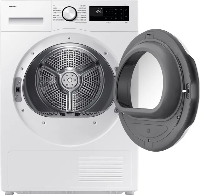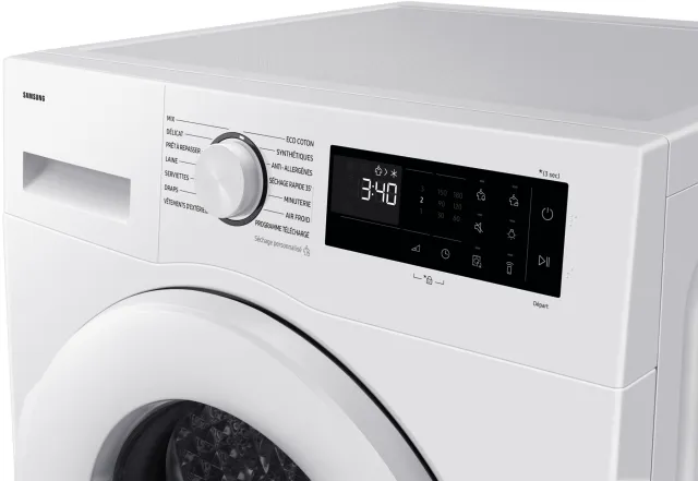 Technologie Pompe à Chaleur et efficacité energétique A+++ En recyclant l'air chaud et en le chauffant à une température inférieure à un sèche-linge à condensation classique, la technologie de pompe à chaleur "Heat Pump Samsung" respecte votre linge et vous permet de faire des économies d'énergie[1] Il a d'ailleurs une Classe énergétique A+++. Jusqu'à 99,9% de désinfection[3] Programme Anti-allergènes Prévenez l'accumulation de bactéries, d'acariens et d'allergènes sur vos vêtements, draps ou peluches. Le programme Anti-allergènes assainit les articles secs ou humides[2] sans altérer les performances de séchage. En diffusant de l'air chaud à haute température il élimine 99% des bactéries[3]. Optez pour la liberté Porte réversible Modifiez le sens d'ouverture de la porte à votre guise. Adaptez-vous facilement à la disposition de votre pièce ou choisissez en fonction de vos habitudes. Et comme le hublot est transparent, vous pouvez vérifier ce qu'il y a à l'intérieur en un coup d'œil ! Option Anti-Pli Gardez vos vêtements secs et sans plis. Lorsque le cycle de séchage est terminé, l'option Anti-Pli déclenche le tambour par intermittence[4] mais sans utiliser d'air chaud pour empêcher les vêtements de rester trop longtemps figés dans le tambour, et de créer ainsi des plis. Filtre 2-en-1 Optimisez les performances et l'entretien de votre sèche-linge grâce au nouveau filtre 2-en-1 qui capte davantage de fibres textiles[5]. Il permet ainsi de supprimer le filtre du condenseur pour un entretien grandement facilité. De plus, une alarme sur le bandeau vous indique quand nettoyer le filtre. Désodorisez avec de l'air Technologie Air Refresh Rafraîchissez vos vêtements sans lavage ! La technologie Air Refresh utilise de lair chaud pour éliminer les odeurs et laisser votre linge frais, comme nettoyé à sec. Une solution rapide et pratique pour un linge toujours impeccable. Air Refresh : la fraîcheur sans effort. Moteur Digital Inverter : fiable et silencieux Pourvu d'un aimant permanent évitant frottements et déperditions d'énergie, ce moteur à induction est particulièrement robuste et silencieux ! En atténuant la friction, il réduit le bruit, les vibrations et rend les pièces du sèche-linge moins sujettes à l'usure. Il est garanti 20 ans[6]. Séchage amélioré Capteurs Optimal Dry OptimalDry ajuste automatiquement le séchage grâce à ses capteurs d'humidité, de température et de nettoyage. Il protège votre linge, optimise la consommation d'énergie et vous alerte pour l'entretien de l'échangeur de chaleur. Un séchage intelligent et efficace. Séchage rapide pour les petites charges Quick Dry 35 minutes Quick Dry 35 sèche 1 kg de linge en seulement 35 minutes[7]. Idéal pour une chemise ou un haut, il utilise une chaleur élevée pour un séchage rapide lorsque vous êtes pressé. Séchez vos vêtements essentiels, quand vous en avez besoin. Simplifiez votre quotidien avec SmartThings Wi-Fi intégré Simplifiez votre séchage avec SmartThings[8]. Suivez et contrôlez votre linge à distance, optimisez votre planning et recevez des recommandations personnalisées[9]. Gérez votre consommation d'énergie et maintenez votre sèche-linge en parfait état. SmartThings Energy Utilisation efficace de l'énergie. Économies intelligentes Optimisez votre énergie avec SmartThings Energy[10]. Suivez votre consommation en temps réel[11] , comparez-la au mois précédent et recevez des alertes en cas de dépassement. Des conseils pour plus d'efficacité et d'économies. SmartThings Home care Entretien intelligent Simplifiez l'entretien de votre lave-linge ou sèche-linge avec SmartThings Home Care[12]. Cette fonction vous alerte lorsque des pièces nécessitent un remplacement et facilite le diagnostic des problèmes. Routines SmartThings Améliorez votre quotidien en adoptant de nouvelles habitudes Désormais, votre maison peut s'adapter à votre emploi du temps chargé. SmartThings vous permet d'automatiser votre maison pour que votre vie quotidienne devienne plus pratique et plus efficace.