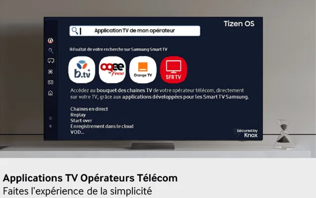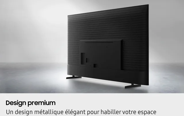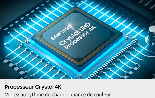 Vibrez au rythme de chaque nuance de couleur, restituée en 4K Processeur Crystal 4K Profitez de tous vos contenus en résolution 4K grâce à la mise à l'échelle automatique de l'IA. Vivez la scène comme si vous y étiez Définition 4K Faites ressortir les petits détails de chaque scène. La résolution 4K UHD possède 4 fois plus de pixels que la résolution FHD classique, créant ainsi des images nettes et ultra-réalistes. Un design élégant Design métal Inspiré par le design de l'aéronautique, ce téléviseur est doté d'un châssis métallique premium et vous offre une expérience véritablement immersive. Personnalisez votre expérience TV Avec One UI Tizen, vous accédez à toutes les fonctionnalités innovantes de Samsung. Vous profitez d'une expérience sécurisée par Samsung Knox sur l'ensemble des appareils SmartThings™. De plus, One UI Tizen prend en charge les mises à jour de Tizen OS pendant les 7 prochaines années. Accès à plus de 150 chaînes gratuites Du contenu 100% gratuit Accéder gratuitement à des chaines Samsung TV plus. Profitez des chaines d'actualité, de sports ainsi que des films, des divertissements, de la musique, des émissions pour enfants et bien plus encore. Avec de nouveaux contenus ajoutées en permanence, il y a toujours plus à découvrir ! Le meilleur de la TV. Gratuitement. Samsung TV Plus Plongez dans une vaste collection d'émissions, de films et d'autres contenus sur Samsung TV Plus. Il est installé gratuitement sur votre téléviseur — aucun paiement, abonnement ou configuration n'est requis. Découvrez ce qu'il y a sur votre écran Click to Search Click to Search enrichit votre expérience visuelle en vous proposant instantanément des recommandations de contenu et plus de détails sur ce que vous regardez, en un seul clic. Vous pouvez découvrir des informations sur les acteurs, notamment leur biographie, leur filmographie et bien plus encore. Votre vie privée, sécurisée. Samsung Knox Security Votre vie privée sécurisée sur TV Samsung. Les données sensibles comme les mots de passe sont protégées, les appareils connectés sont surveillés et les applications ou sites malveillants sont automatiquement bloqués. Et une équipe de sécurité Samsung apporte des mises à jour constantes. Découvrez facilement et accédez à tous vos jeux vidéos à partir d'un écran Gaming Hub Votre téléviseur dispose d'un espace dédié aux jeux vidéo, regroupant des applications de cloud gaming en un seul endroit. Il propose également des recommandations basées sur vos préférences de jeu, vous permettant ainsi de découvrir facilement de nouvelles pépites. Des images fluides, nettes et précises Motion Xcelerator Profitez d'une expérience de jeu optimale grâce à la technologie Motion Xcelereator qui optimise en temps réel la fluidité de chaque image. Gérez vos appareils connectés depuis votre téléviseur SmartThings™ Grâce à SmartThings™, vous pouvez connecter et contrôler en toute transparence des appareils compatibles avec les normes Matter et HCA, sans avoir besoin d'un appareil supplémentaire. TV et barre de son, une harmonie parfaite Q-Symphony La technologie Q-Symphony synchronise tous les haut-parleurs du téléviseur avec les haut-parleurs de la barre de son Q-Series. Ils fonctionnent simultanément pour un meilleur effet de son Surround. Un son immersif et réaliste Object Tracking Sound Lite (OTS Lite) Avec la technologie OTS, le son se déplace de manière dynamique suivant le mouvement des objets à l'écran grâce aux haut-parleurs placés autour du téléviseur. Un son optimisé et remastérisé en fonction de votre contenu et de votre environnement Adaptive Sound Vivez le son avec des voix claires et des tonalités équilibrées. Le processeur avec IA de votre téléviseur reconnaît les différents sons, les dialogues et la musique de fond. Il optimise aussi en fonction de l'acoustique de votre pièce, avant d'affiner le rendu grâce à la remasterisation audio. Réduisez votre consommation d'énergie grâce à une analyse intelligente AI Energy Mode Réduisez facilement votre consommation d'énergie en activant le mode Énergie AI. Votre téléviseur ajustera automatiquement sa luminosité en fonction de l'éclairage de la pièce et de votre activité ainsi que la luminosité de différentes scènes à l'écran pour économiser encore plus d'énergie. Plus de contrastes et plus de luminosité HDR La technologie HDR (High Dynamic Range) optimise chaque image et permet de rendre chaque détail visible quel que soit le niveau de luminosité. Vos contenus préférés en 4K 4K Upscaling L'Upscaling 4K vous offre une expérience visuelle améliorée en 4K pour tous vos contenus. Des couleurs riches et naturelles PurColor La technologie PurColor permet d'augmenter le nombre de couleurs visibles pour proposer un rendu d'image plus détaillé et plus réaliste. Plus de profondeur et de couleurs Amplificateur de contraste La fonction Contrast Enhancer ajuste le contraste pour donner plus de profondeur et sublimer votre qualité d'image Sublime ta journée avec des expériences lifestyle personnalisées Samsung Daily+ Découvrez des applications et services pour la santé, le travail et le lifestyle sur Samsung Daily+. Accédez à SmartThings™, Workout Tracker, karaoké et bien plus, le tout en un seul endroit. Contrôlez votre TV avec votre téléphone Quick Remote Grâce à votre mobile, vous pouvez accéder aux menus clés des Smart TV Tizen : média, Gaming Hub, Daily+, les paramètres, le mode ambiant. Quick Remote peut également servir de télécommande pour changer de chaîne, régler le volume et bien plus encore, directement depuis votre téléphone. Multitâche facile sur plusieurs écrans Multi Control Utilisez votre souris pour déplacer du contenu d'un écran à l'autre, ou un clavier sur des appareils. Votre TV peut se connecter à des moniteurs et appareils Galaxy pour une expérience 